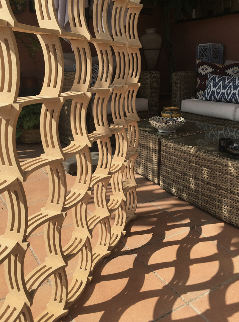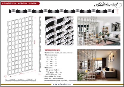 Celosías con un diseño exclusivo de la marca Andaluciart® para la decoración de espacios interiores y exteriores en el material más adecuado, aluminio, PVC, DM con acabados pintados en color RAL, metalizados y oxirón.