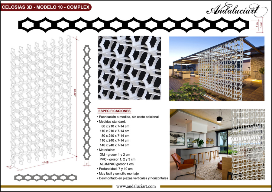 Celosias para arquitectura, diseñadas para dar un toque exclusivo en la decoración de edificios, nuestra marca Andaluciart® presenta un catálogo con diseños exclusivos que son de gran ayuda para arquitectos e interioristas, con materiales recomendados para exterior e interior, y con formato standard o fabricación a medida sin ningún coste adicional