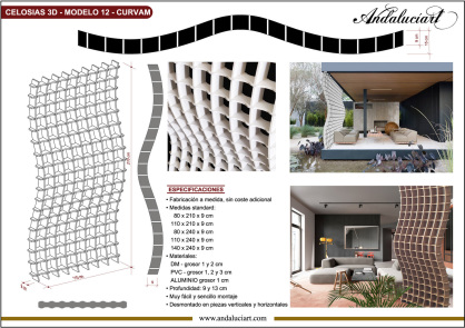 Andaluciart® y sus modelos de celosías arquitectónicas 3D, un nuevo concepto en el diseño de celosías, para la decoración en edificios, hoteles, restaurantes y viviendas, aportan un toque exclusivo en el interiorismo y la arquitectura. Fabricamos a medida o el formato standard, en materiales para exterior como el aluminio y el PVC, para interiores la madera y el DM, con acabados lacados en color RAL, metalizados, oxirón, y el metal satinado o pulido.