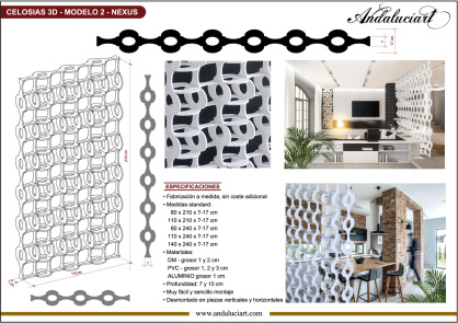 Diseño de celosías tipo 3D, fabricadas con un diseño exclusivo y actual, que nuestra marca Andaluciart®, con diferentes modelos pueden ser de gran ayuda en proyectos de Arquitectura e Interiorismo. Materiales adecuados para exterior e interior, fabricación a medida sin coste adicional.