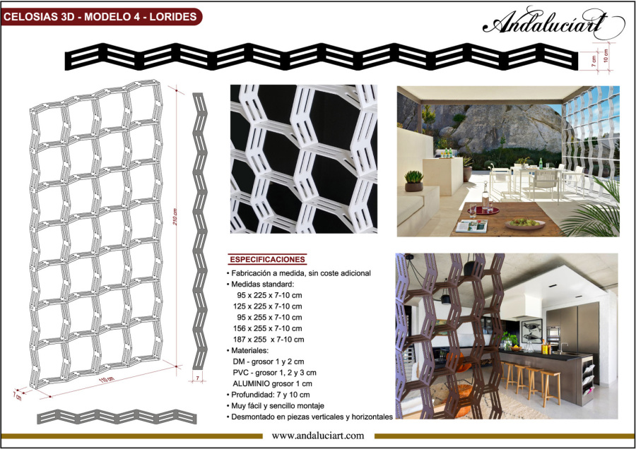 Paneles decorativos con celosias tipo 3D, de nuestra marca Andaluciart® fabricadas en materiales perfectos para exterior e interior en la decoración de fachadas, separadores de ambientes , revestimientos en paredes, etc. Una solución muy moderna para la arquitectura, en viviendas, hoteles, restaurantes y comercios.
