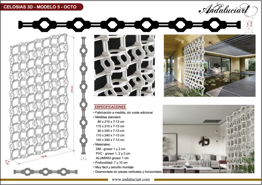 Celosías marca Andaluciart® para proyectos de interiorismo y arquitectura, un solución muy actual en la decoracion de separadores de ambientes y revestimientos en fachadas de edificios con los mejores materiales, PVC, aluminio, DM y madera.