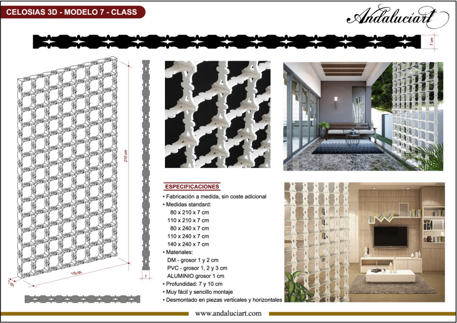 Celosías arquitectónicas, muy utilzadas en la decoración de interiores y en edificios, para el revestimiento de fachadas, paredes, etc. La marca Andaluciart®, en exclusiva presenta sus nuevos diseños de celosías, un nuevo concepto en paneles decorativos para la arquitectura. Los materiales de fabricación son Madera, DM, PVC y Aluminio.