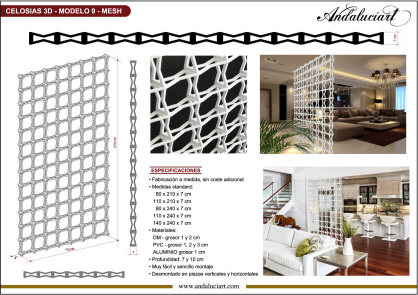 Un nuevo concepto en el diseño de celosías arquitectónicas, la marca Andaluciart®, en exclusiva presenta sus nuevos modelos de celosías para la decoración de espacios, en interiorismo y arquitectura, fabricación a medida sin ningún coste adicional o medidas standard, en los diferentes materiales para interior o exterior
